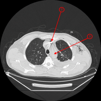 С целью дальнейшей верификации выполнили КТ ОГК и выявили, что инородное тело находится в дуге аорты.