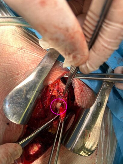 Учитывая, что инородное тело (осколок) достаточно больших размеров, интимно прилегающий к магистральным сосудам, был предположен высокий риск развития пролежня с дальнейшим разрывом аорты. В связи с этим был проведен консилиум главных специалистов, которые определили показания для удаления инородного тела – осколка.