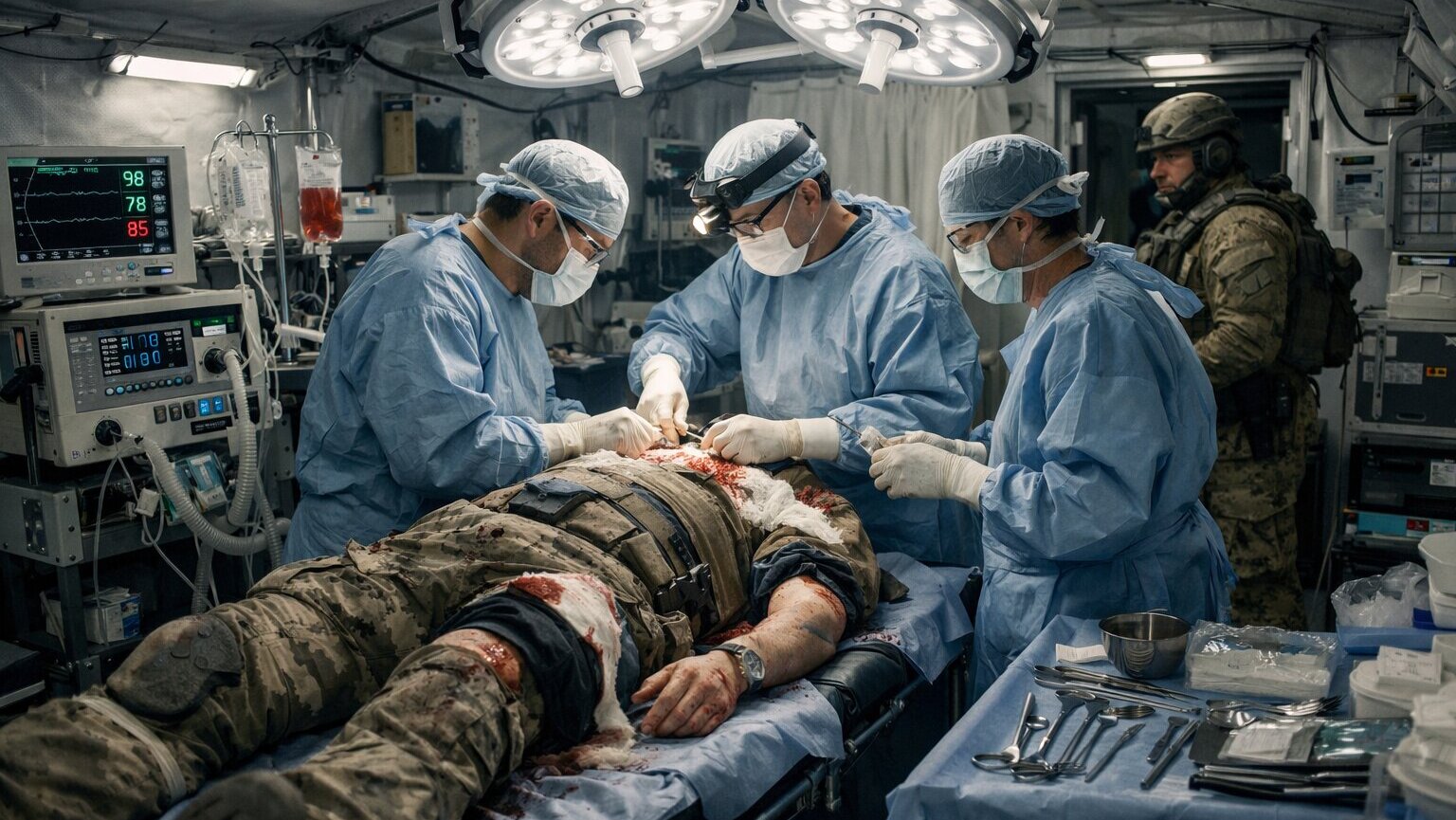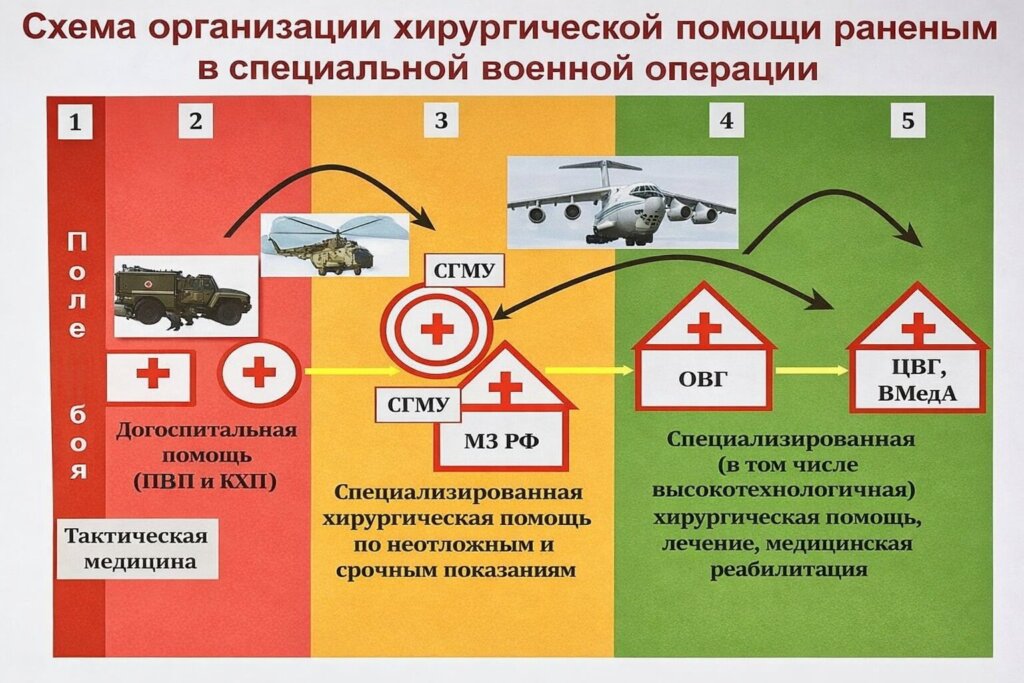 Пациент М. при выполнении боевых задач СВО получил огнестрельное осколочное торакоабдоминальное ранение с повреждением 1-2 сегмента левого легкого, диафрагмы, левой доли печени, сквозное ранение желудка, селезенки, тонкой и толстой кишки. На этапах эвакуации были выполнены: ПХО ран, торакоцентез, лапаротомия, ушивание ран толстой кишки, резекция тонкой кишки, спленэктомия. На последующем этапе лечения выполнили релапаротомию, наложение еюно-еюноанастомоза, ушивание сквозного ранения желудка (время между первым и вторым этапом составило около 2х часов.) После чего по этапу эвакуации был доставлен в ГВКГ им.Н.Н.Бурденко.