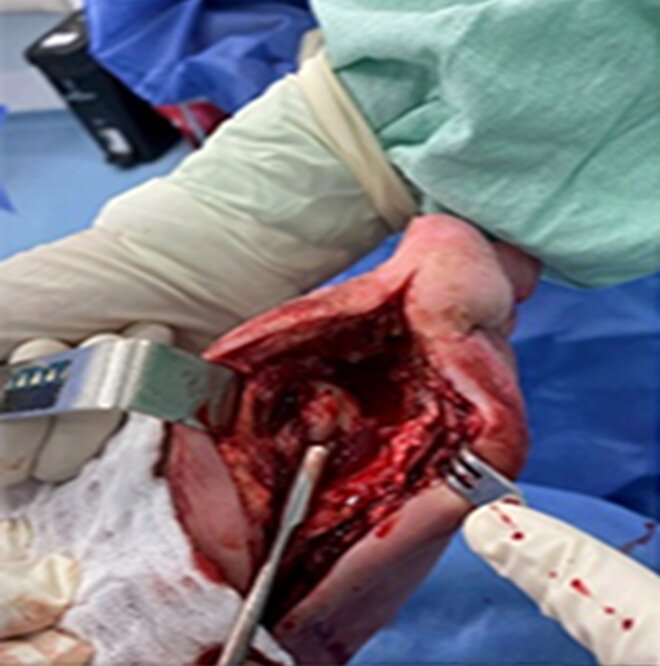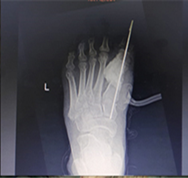 В анамнезе была обнаружена медиальная подошвенная язва, которую неоднократно лечили в разных учреждениях, но без благоприятного клинического результата. На основании анамнеза и результатов параклинических исследований было принято решение о проведении хирургического вмешательства — радикальной обработки гнойно-некротического очага, включая остеотомию первой плюсневой кости от середины до головки и основной фаланги.