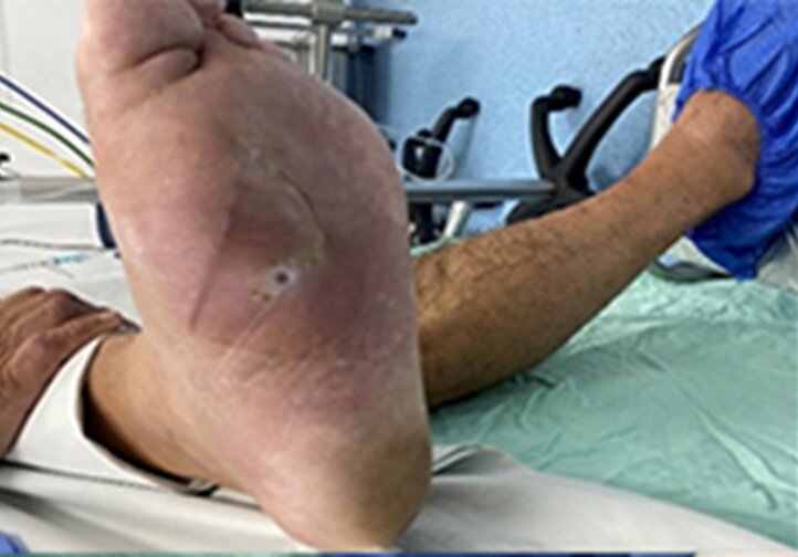59-летний пациент поступил в отделение гнойной хирургии с жалобами на боли в левой стопе. При осмотре и пальпации был обнаружен отек, связанный с воспалительными изменениями на медиальной и дистальной областях подошвенной поверхности стопы. Проведено комплексное обследование, включая рентгенологическое и КТ стопы. Выявлена деструкция головки и диафиза первой плюсневой кости, а также и проксимальной головки основной фаланги. Результаты соответствующих лабораторных исследований показали, что уровень гликированного гемоглобина (HbA1c) составил 8,2.