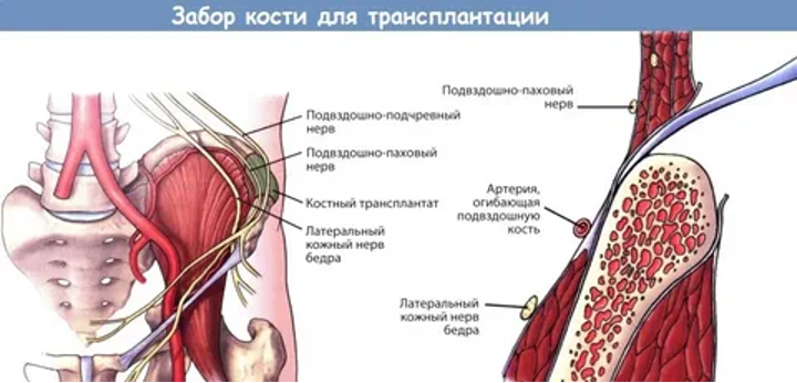 Аутологичный трансплантат гребня подвздошной кости считается золотым стандартом в качестве источника костного трансплантата в хирургии по методике Masquelet из-за различных факторов. Основным из них является относительно высокая концентрация мезенхимальных клеток (МСК), которые могут дифференцироваться в другие типы клеточных тканей, включая остеобласты, а также большое количество факторов роста, таких как TGF-B (трансформирующий фактор роста бета) и PDGF (тромбоцитарный фактор). Они играют важную роль в развитии костной ткани и пролиферации костных клеток. Костные трансплантаты фиксировали интрамедуллярно спицей Киршнера. Рану удалось закрыть местными тканями, предварительно дренировав с использованием активной аспирации.