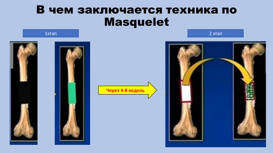 Метод Masquelet, также известный как метод индуцированной мембраны, представляет собой двухэтапную процедуру лечения костных дефектов. На первом этапе костные дефекты заполняются цементом из полиметилметакрилата (ПММА). Цемент из ПММА используется в качестве прокладки для устранения «мёртвых зон», системы местной доставки антибиотиков и биореакторной камеры для стимуляции остеогенеза. На втором этапе проводится остеосинтез с использованием аутотрансплантата.
