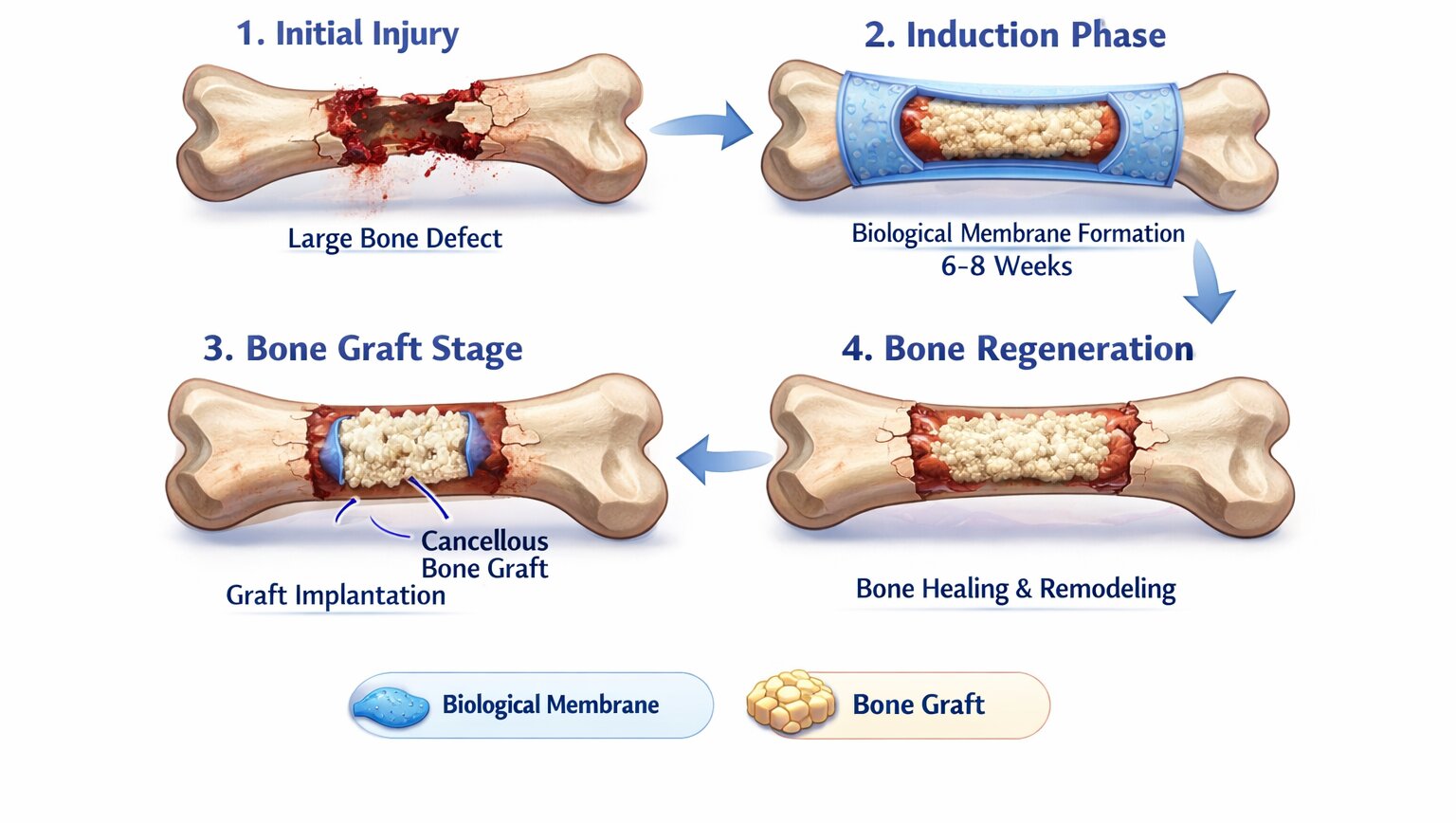 С биологической точки зрения имплантационная мембрана — это камера для регенерации тканей, которая способствует интеграции костного трансплантата и формированию костной ткани тремя способами. Во-первых, мембрана действует как физический барьер между трансплантатом и окружающими его мягкими тканями, предотвращая инвазию макрофагов и последующую резорбцию трансплантата. Во-вторых, мембрана улучшает процессы ангиогенеза и остеогенеза, выделяя ключевые факторы роста, в том числе фактор роста эндотелия сосудов (VEGF), трансформирующий фактор роста-β1 (TGF-β1) и костный морфогенетический белок-2 (BMP-2).