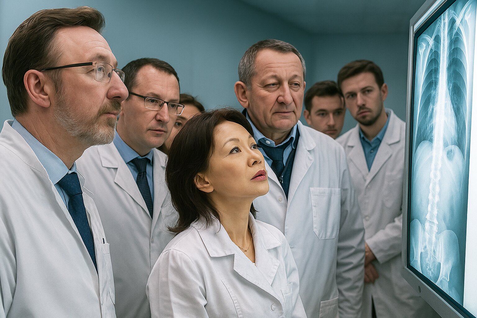 Пациентка консультирована хирургом-онкологом, торакальным хирургом в НМИЦ хирургии им. А.В. Вишневского. Проведен консилиум специалистов лучевой диагностики,  онкологический консилиум, по результатам которого новообразование левого лёгкого расценено как доброкачественное, рекомендована резекция S10 левого лёгкого со срочным гистологическим исследованием операционного материала, радикальная мастэктомия слева.