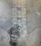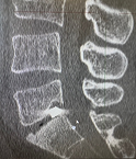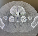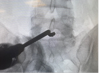 Пациент П., 05.05.2025 г. при взрыве снаряда получил слепое проникающее в позвоночный канал осколочное ранение пояснично-крестцового отдела позвоночника. В течение двух месяцев пациенту оказывалось консервативное лечение. 13.07.2025 г. пациент поступил на лечение в ГВКГ им. ак. Н.Н. Бурденко. При обследовании на КТ выявлен осколок металлической плотности в межтеловом промежутке по срединной линии у заднего края тел на уровне пятого поясничного и первого крестцового позвонков. Осколок прошел через междужковый промежуток сзади по краю фасеточного сустава. У больного имелась клиника болевого синдрома в пояснично-крестцовом отделе позвоночника во время движений и парестезий в проекции S1 корешка. Силовых расстройств не было.