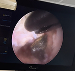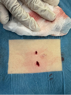 15.07.2025 г. проведена операция: эндоскопическая бипортальная ревизия, санация, удаление осколка из межтелового промежутка на уровне L5-S1 позвонков. Операция выполнена через два минимальных разреза по 0,7 см на уровне ранения. Под контролем флюороскопии в соответствии с методикой сформирован порт для эндоскопа и второй порт для рабочего инструмента. Операция выполнялась в водной среде под постоянной ирригацией физиологическим раствором. В ходе операции осуществлен атравматичный бескровный доступ к проблемному уровню без скелетирования (без рассечения) паравертебральных мышц. При помощи специального эндоскопического инструментария поэтапно, в соответствие с методикой, визуализирован проходящий S1 корешок и дуральный мешок, задняя продольная связка, осуществлен доступ к осколку. Последний выделен при помощи Г-образного крючка и удален при помощи конхотомов. Выделение и удаление осколка не сопровождалось тракцией невральных структур. Ход операции, начиная от доступа, внешний вид интраоперационной раны до и после удаления осколка представлены на фото.